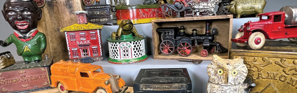 The March cast Iron Auction will feature hundreds of interesting lots ranging from Still & Mechanical Banks, Doorstops and figural cast iron pieces, TootsieToys, Horse drawn and Automotive Toys, Bell Toys, and much more. Featuring over 100 examples from the Tony Lasala automotive collection.
