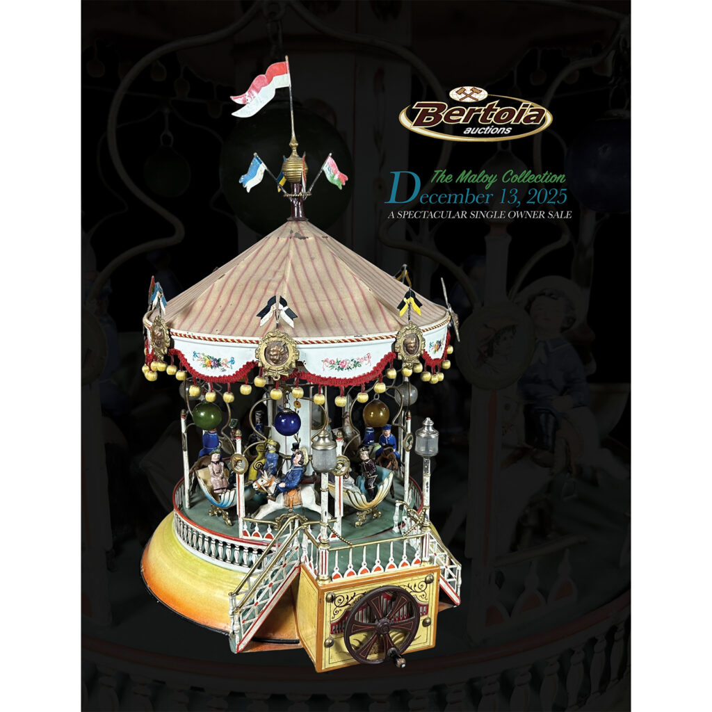 The second half of the Curtis & Lina Smith collection with a sharp focus on pre-1900 Americana clockwork toys, colorful American tin, superb mechanical banks, and early German childrens squeak toys. The Bradley Kaplan Lionel collection Part II. European boats & trains from the late Tony Cuff UK Collection. Early Japanese automotive toys from Ira Bernstein. Choice cast iron toys and more.